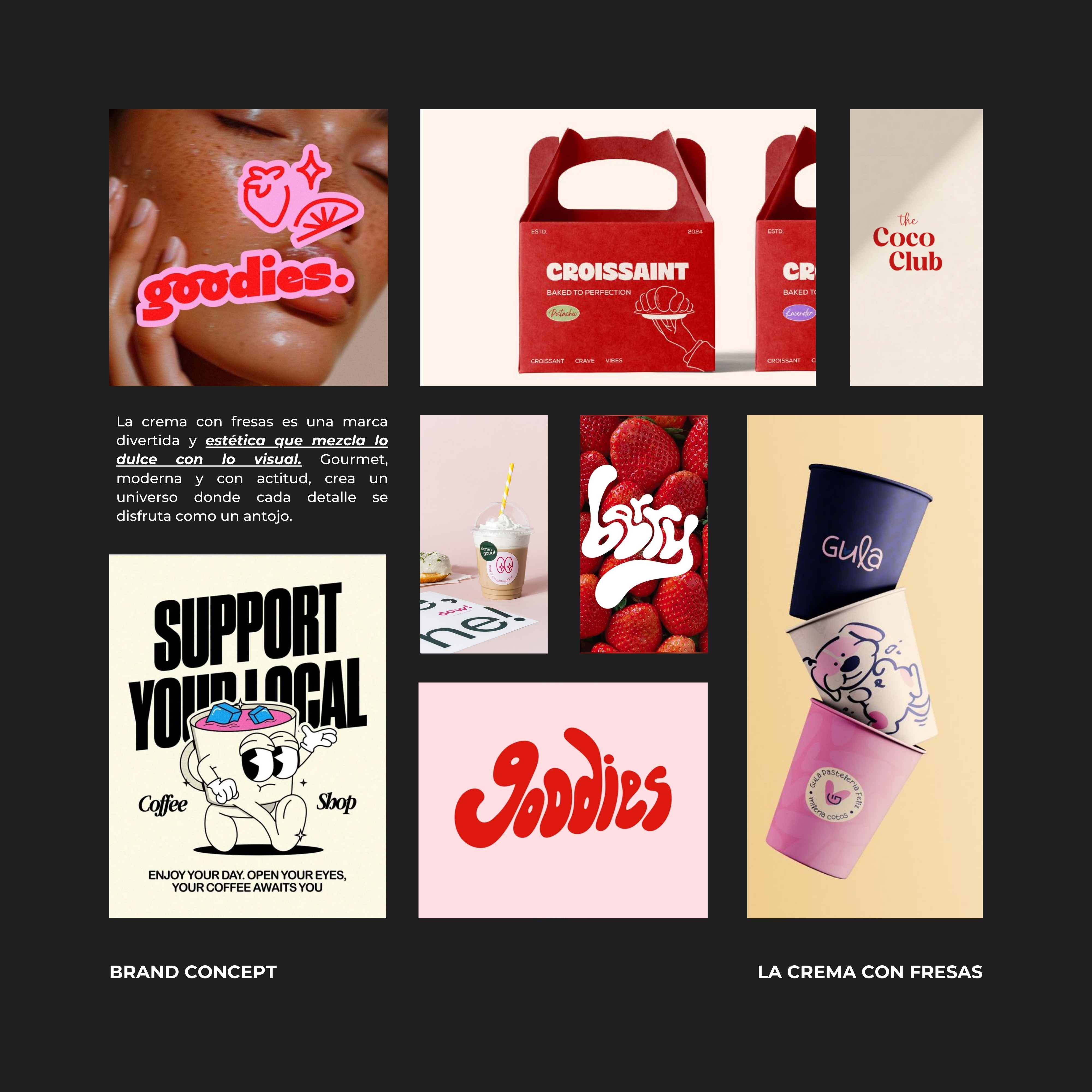 La Crema con Fresas es una marca divertida, gourmet y visualmente deliciosa. Inspirada en los antojos que se disfrutan con los ojos y el paladar, combina tonos cremosos y frambuesa con una identidad moderna y femenina. Su universo visual está compuesto por tipografías redondeadas, un personaje encantador y aplicaciones que celebran el goce estético de lo dulce.
