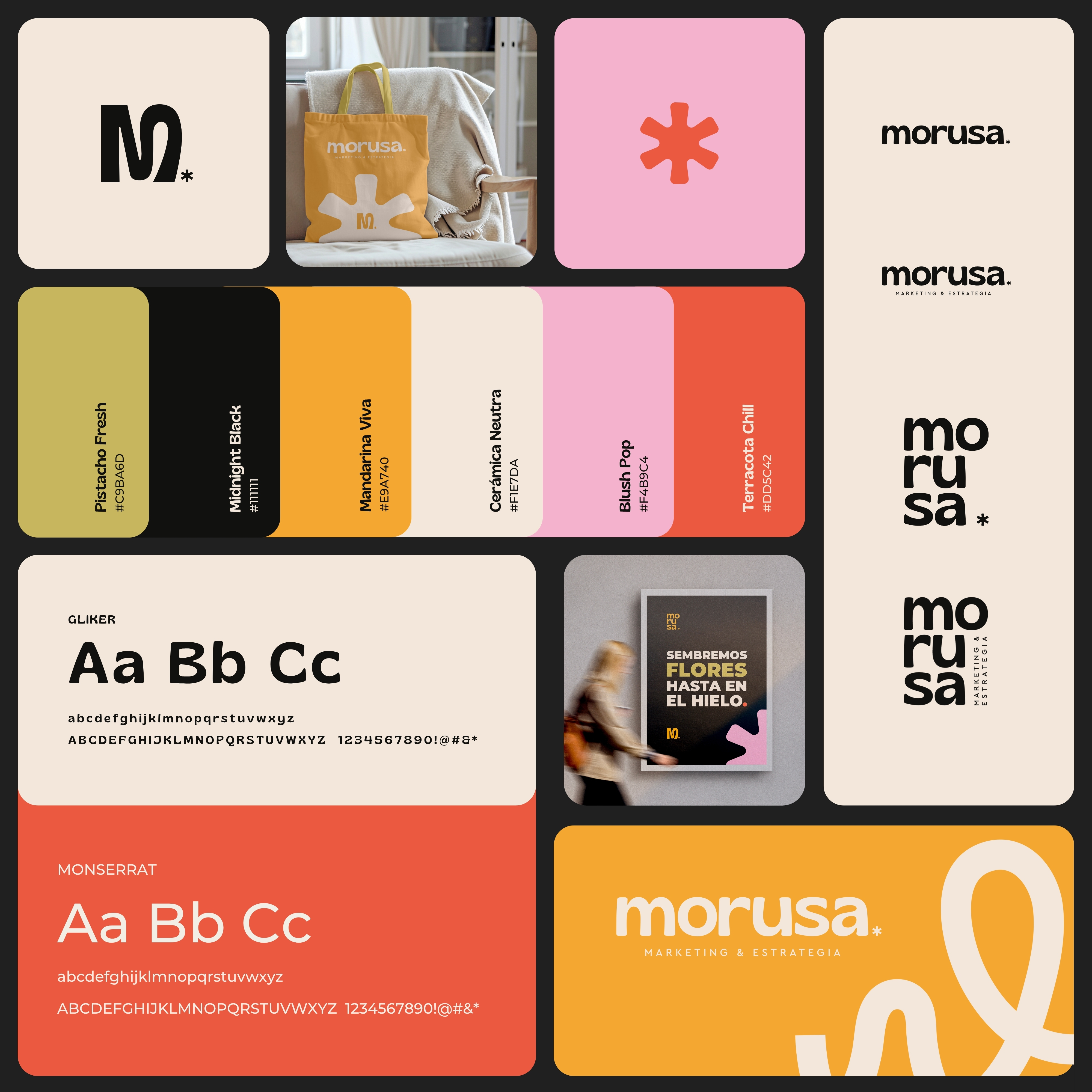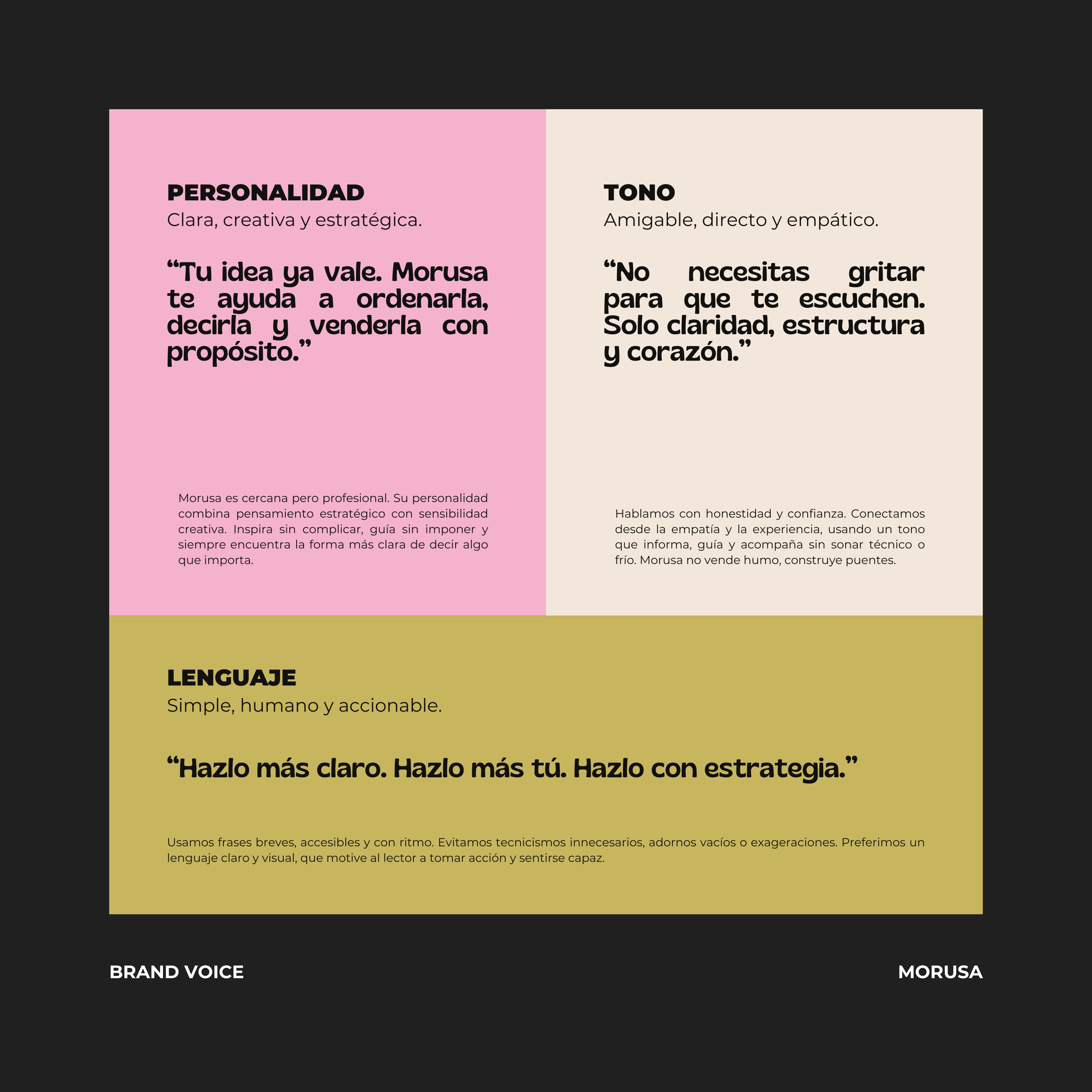 Su identidad visual es cálida, cercana y profesional, con una estética que mezcla lo humano y lo estratégico. Desde el nombre hasta cada ícono, todo en Morusa está diseñado para transmitir claridad, confianza y propósito. Un branding pensado para personas que quieren emprender sin perder su esencia.